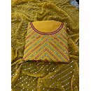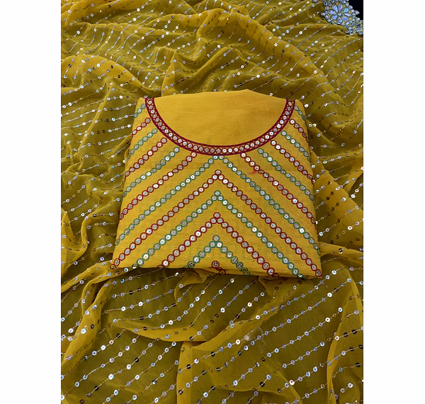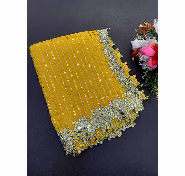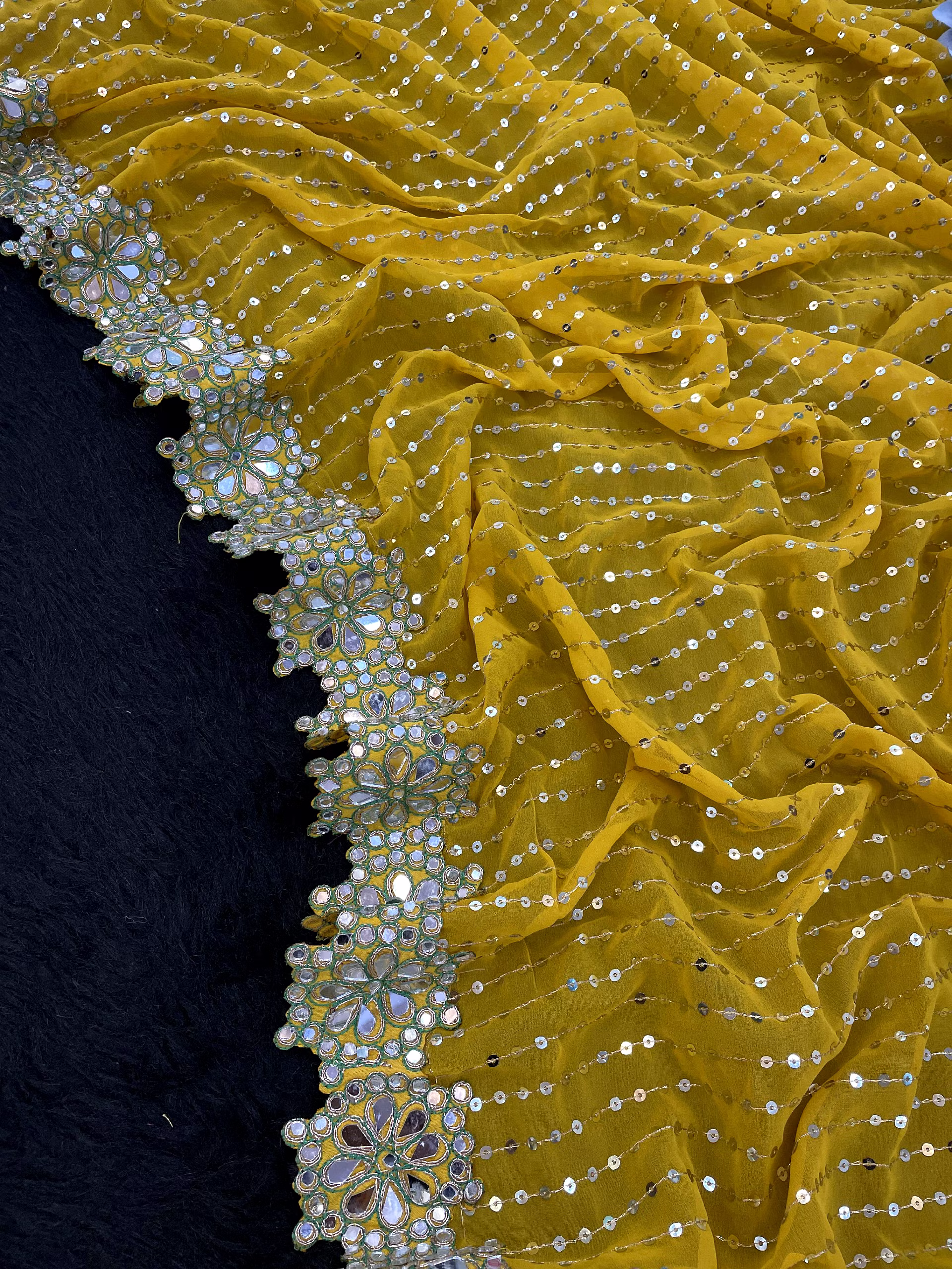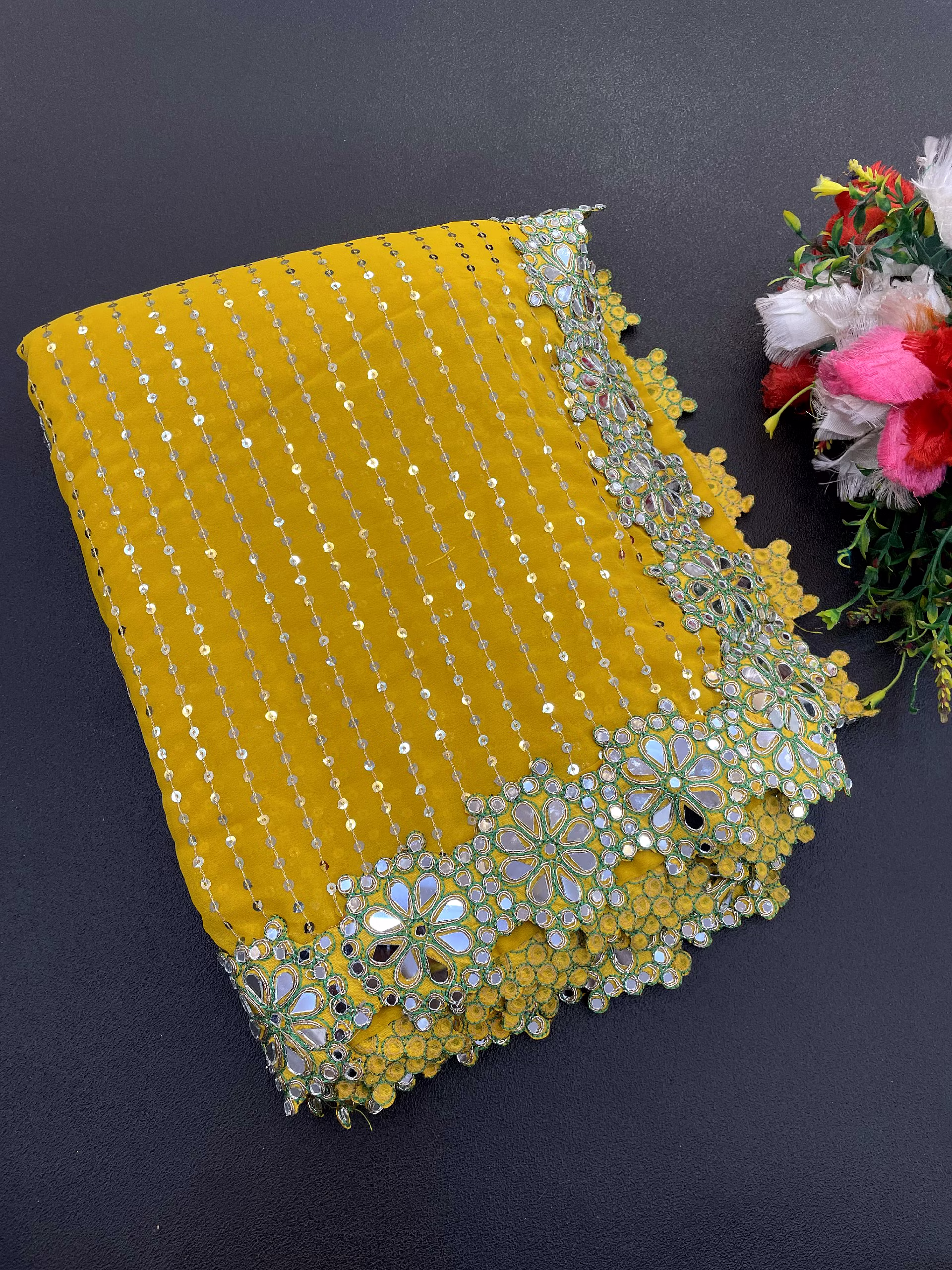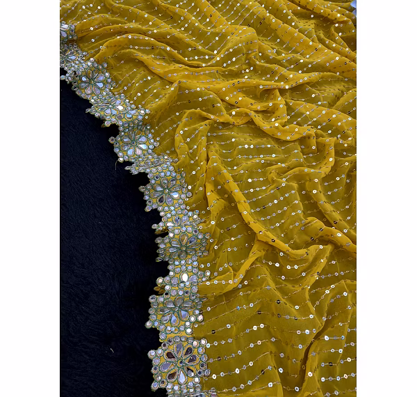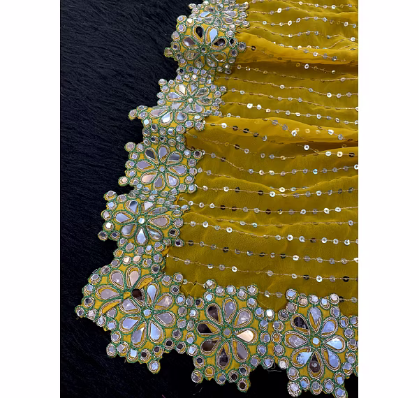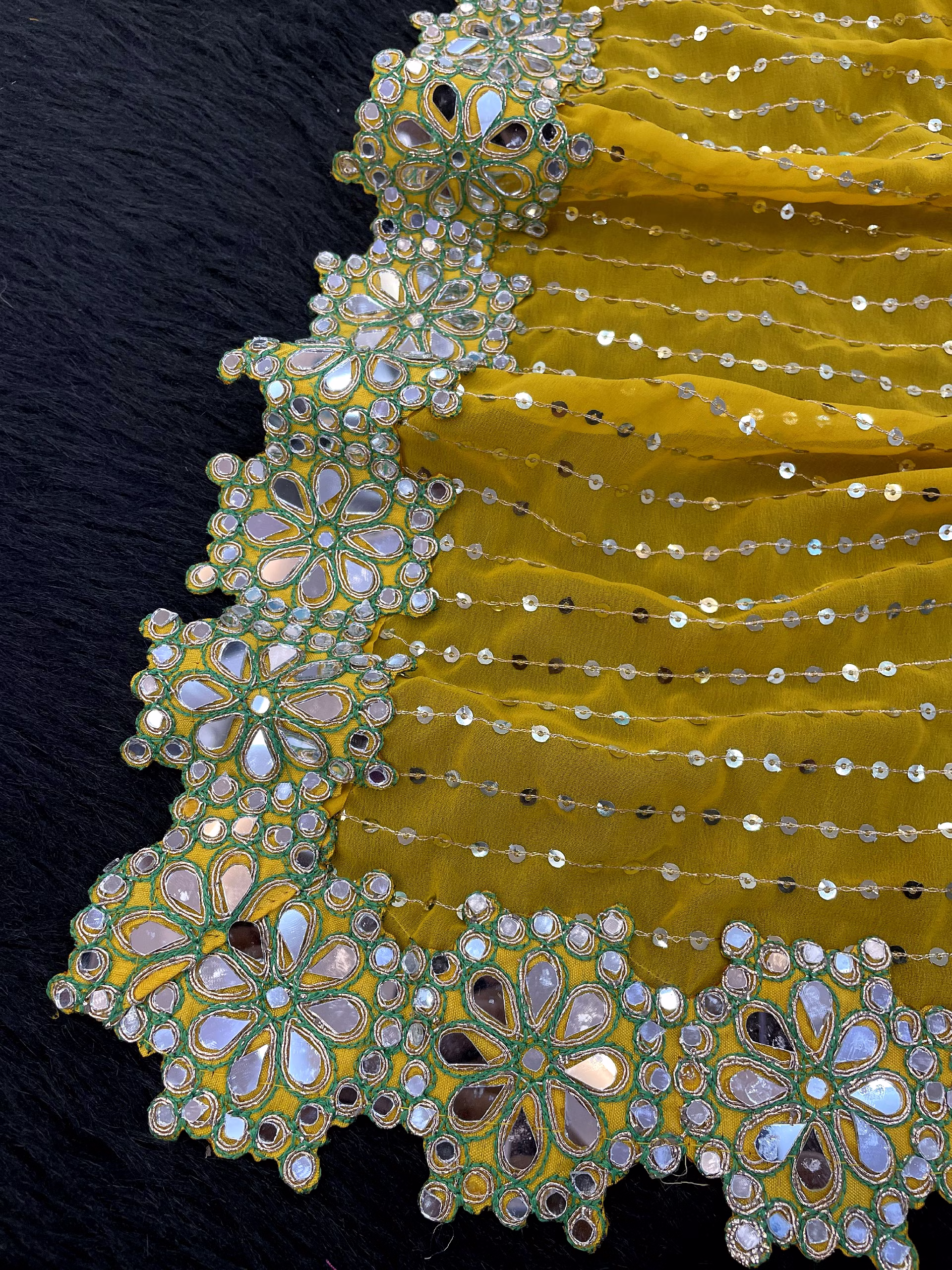 Experience elegance and tradition with our Yellow Georgette Mirror Work Saree. Adorned with intricate mirror work, this saree is a perfect blend of sophistication and style.