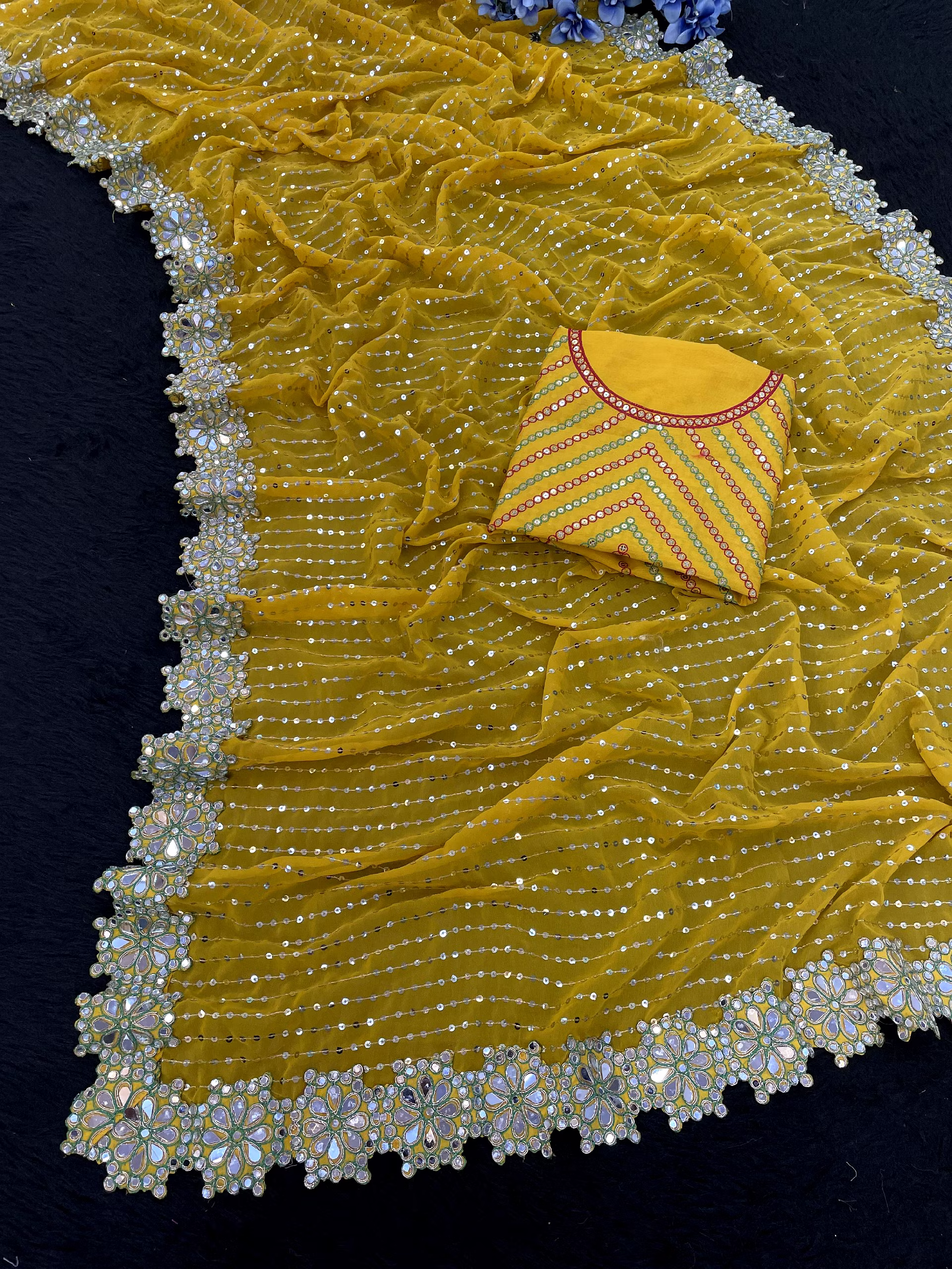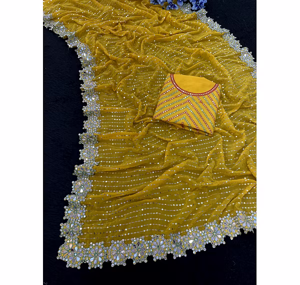 Indulge in the enchanting beauty of our Yellow Georgette Mirror Work Saree, meticulously crafted to enhance your grace and charm. The intricate mirror work adds a touch of glamour, making you stand out at any occasion.
