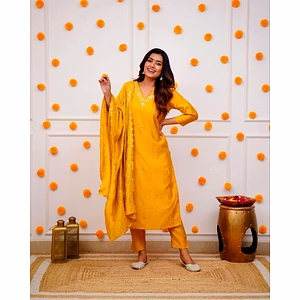 Step into the spotlight with the Yellow Maslin Silk Kurti Pant Set with Beautiful Embroidery and Dupatta. This ensemble is not just about looking good; it's about feeling confident and stylish. The soft, luxurious fabric drapes beautifully, providing a flattering silhouette that complements all body types. The kurti features a modern cut that balances traditional aesthetics with contemporary fashion, making it a versatile addition to your wardrobe.