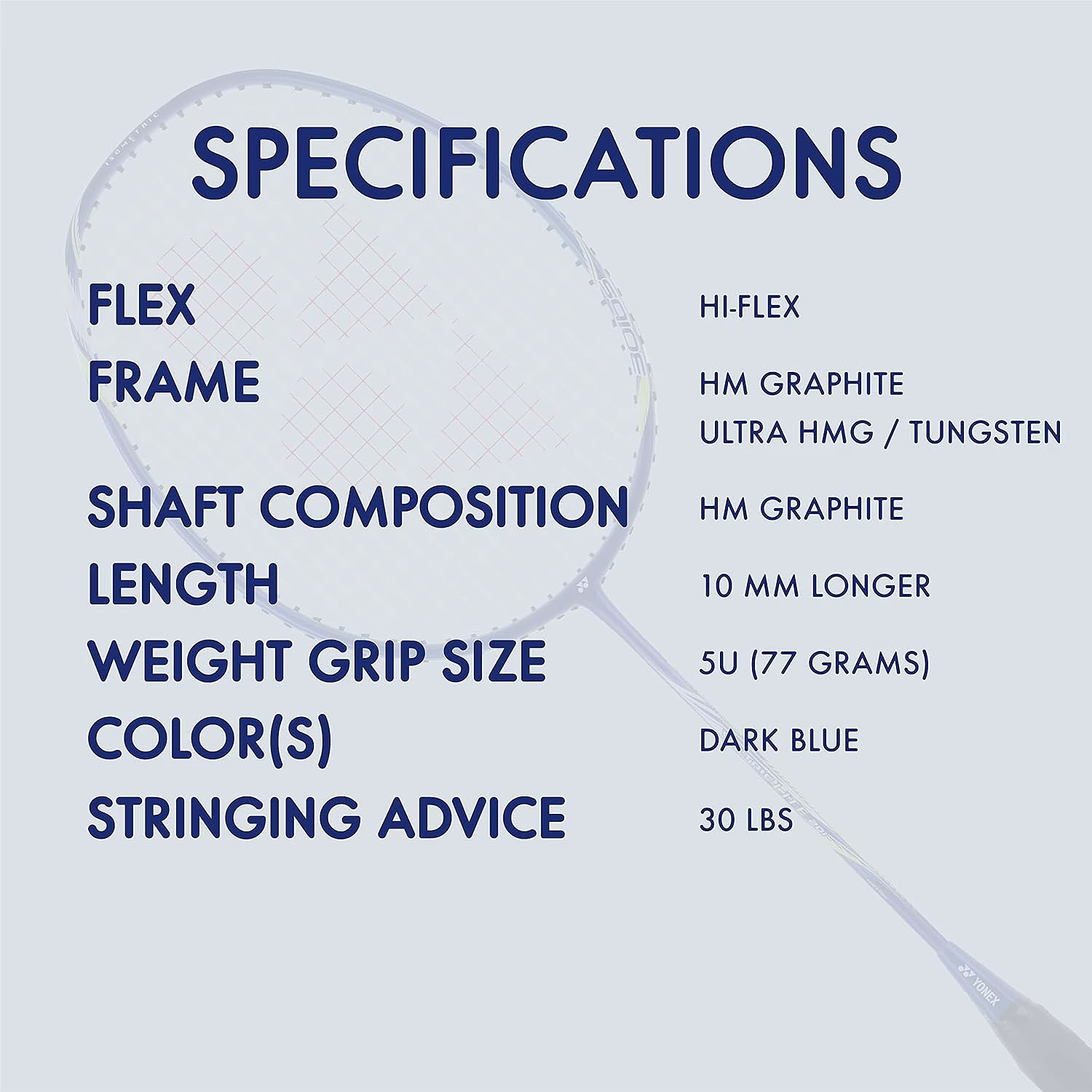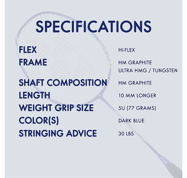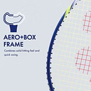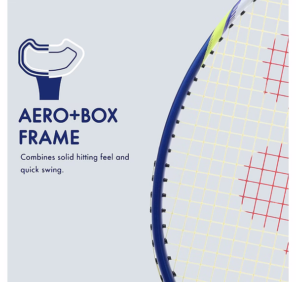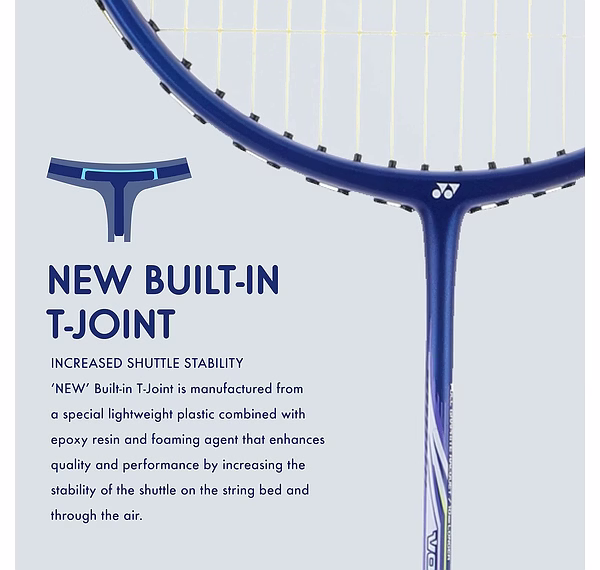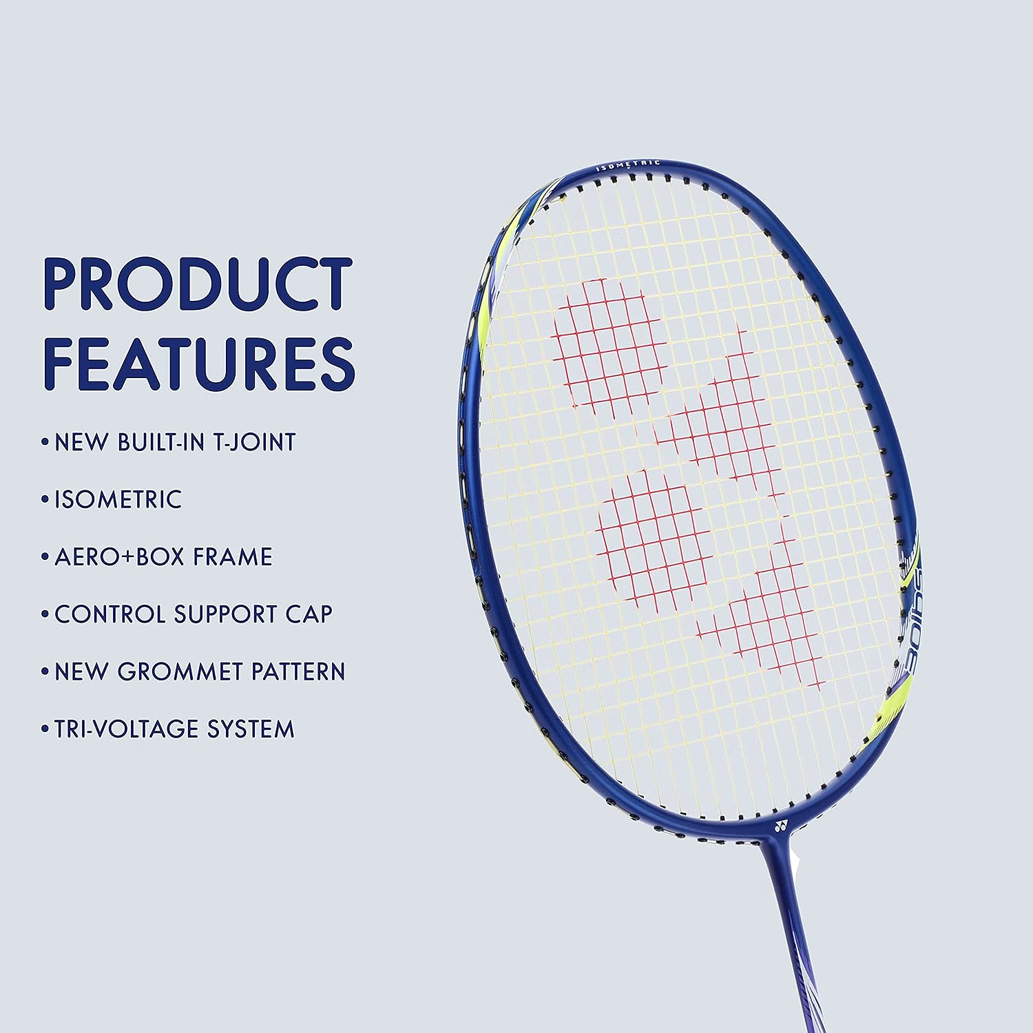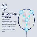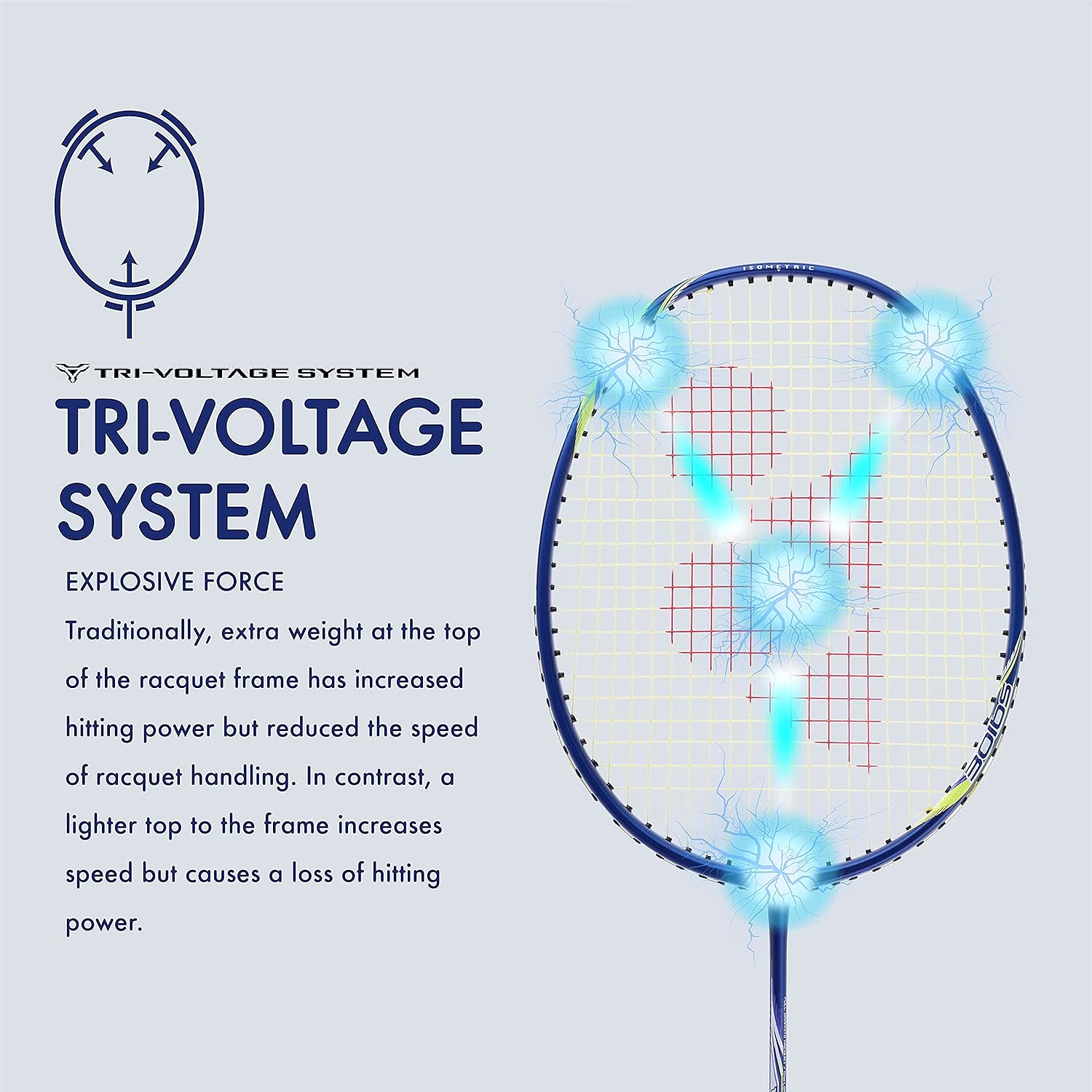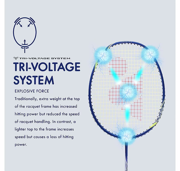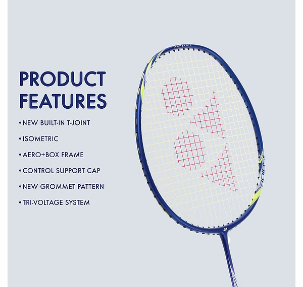 # NEW BUILT-IN T-JOINT - Increased Shuttle Stability #NEW# Built-in T-Joint is manufactured from a special lightweight plastic combined with epoxy resin and foaming agent that enhances quality and performance by increasing the stability of the shuttle on the string bed and through the air. # ISOMETRIC - Enlarged Sweet Spot compared to a conventional round frame, a square-shaped ISOMETRIC racquet generates a larger sweet spot by optimizing the intersection of the main and cross strings. ISOMETRIC delivers greater control without sacrificing power. # AERO+BOX FRAME - Combines solid hitting feel and quick swing. # Control Support CAP - Sharp Maneuverability. The control support cap provides an 88% wider flat surface compared with an ordinary racquet for easier gripping, fast follow-through and the sharpest maneuverability. # NEW GROMMET PATTERN - High-Performance. The single-pass grommet hole construction provides more grommet holes for a more high-performance stringing pattern. # TRI-VOLTAGE SYSTEM - Explosive Force. Traditionally, extra weight at the top of the racquet frame has increased hitting power but reduced the speed of racquet handling. In contrast, a lighter top to the frame increases speed but causes a loss of hitting power.